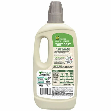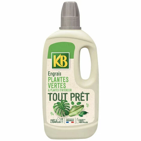 Cetengrais tout prêt plantes vertes et plantes d’intérieur KB se verse directement dans le pot pour nourrir vos plantes facilement. Sa formule à base de minéraux (magnésium, fer, manganèse …) est facilement assimilable par les racines. Adapté à tous types de plantes vertes et d’intérieur, ce produit apporte une nourriture équilibrée et rend vos plantes plus vertes et en bonne santé en 7 jours d’utilisation. L’engrais est à donner 2 semaines après le rempotage, uniquement en période de croissance et pas sur un terreau desséché. Vous pouvez nettoyer les feuilles pour favoriser la photosynthèse et avoir des plantes encore plus vertes.