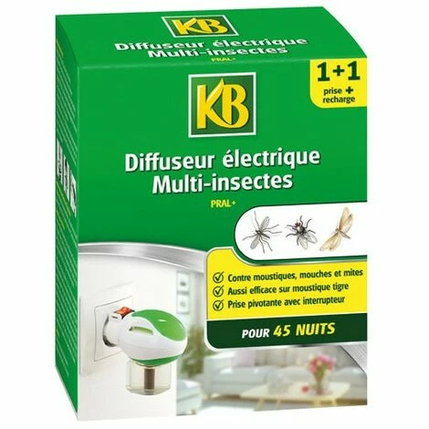 Diffuseur électrique multi-insectes + recharge 35ml /nc de la marque KB. Liquide à base de pralléthrine pour combattre tout type de moustiques, y compris le moustique tigre. Pour un usage grand public. Contre moustiques, mouches et mites. Efficace jusqu’à 45 nuits même fenêtre ouverte.