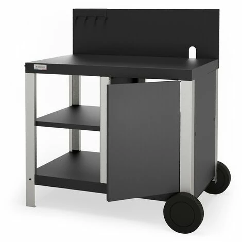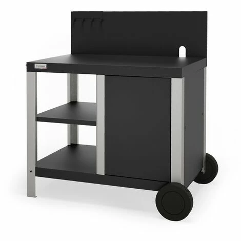 Déplacement facile sur tout type de terrain : 2 roues avec enjoliveurs et 1 poignéeLarge espace de travail : Plateau supérieur 87*54 pouvant recevoir la plancha Allure 260 avec son couvercleEspace de rangement fonctionnel : 2 étagères, 1 espace de rangement fermé pour la bouteille de gaz et un porte-ustentiles inclus